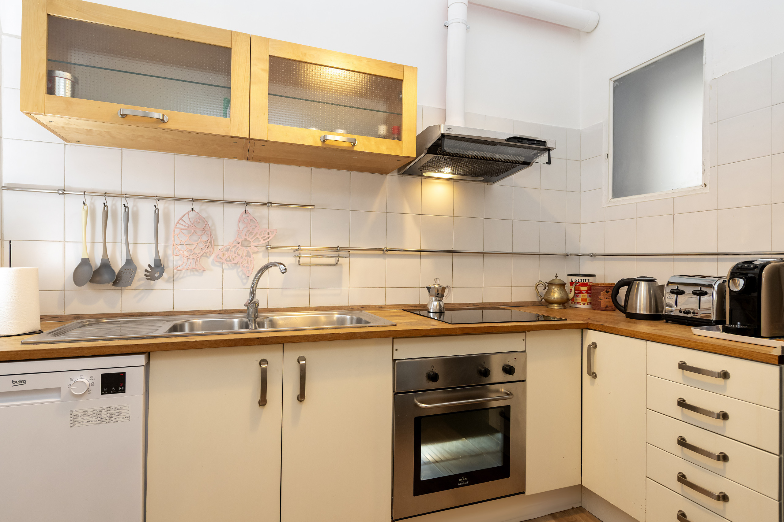 L'appartamento è dotato di lavatrice e asciugatrice. La cucina è attrezzata con frigorifero, lavastoviglie, forno elettrico, microonde e tutto il necessario per cucinare e mangiare.