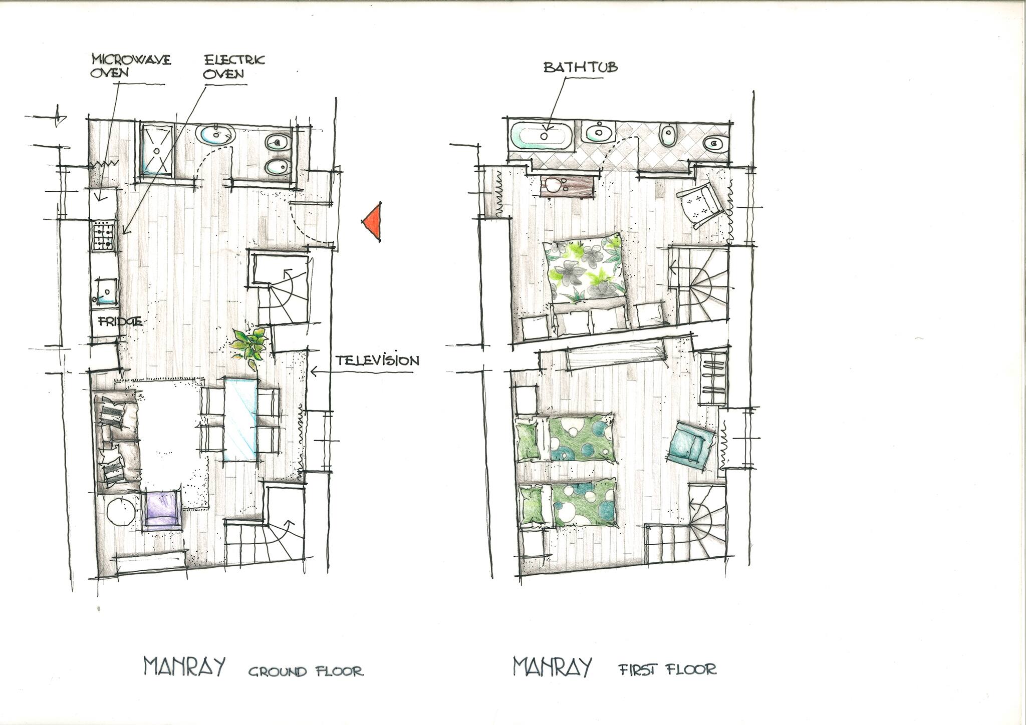 Upstairs, the sleeping area includes a well-appointed master bedroom with a double bed, along with a second bedroom featuring two single beds—perfect for families or groups of friends. A second bathroom with bathtub/shower ensures added comfort and practicality.