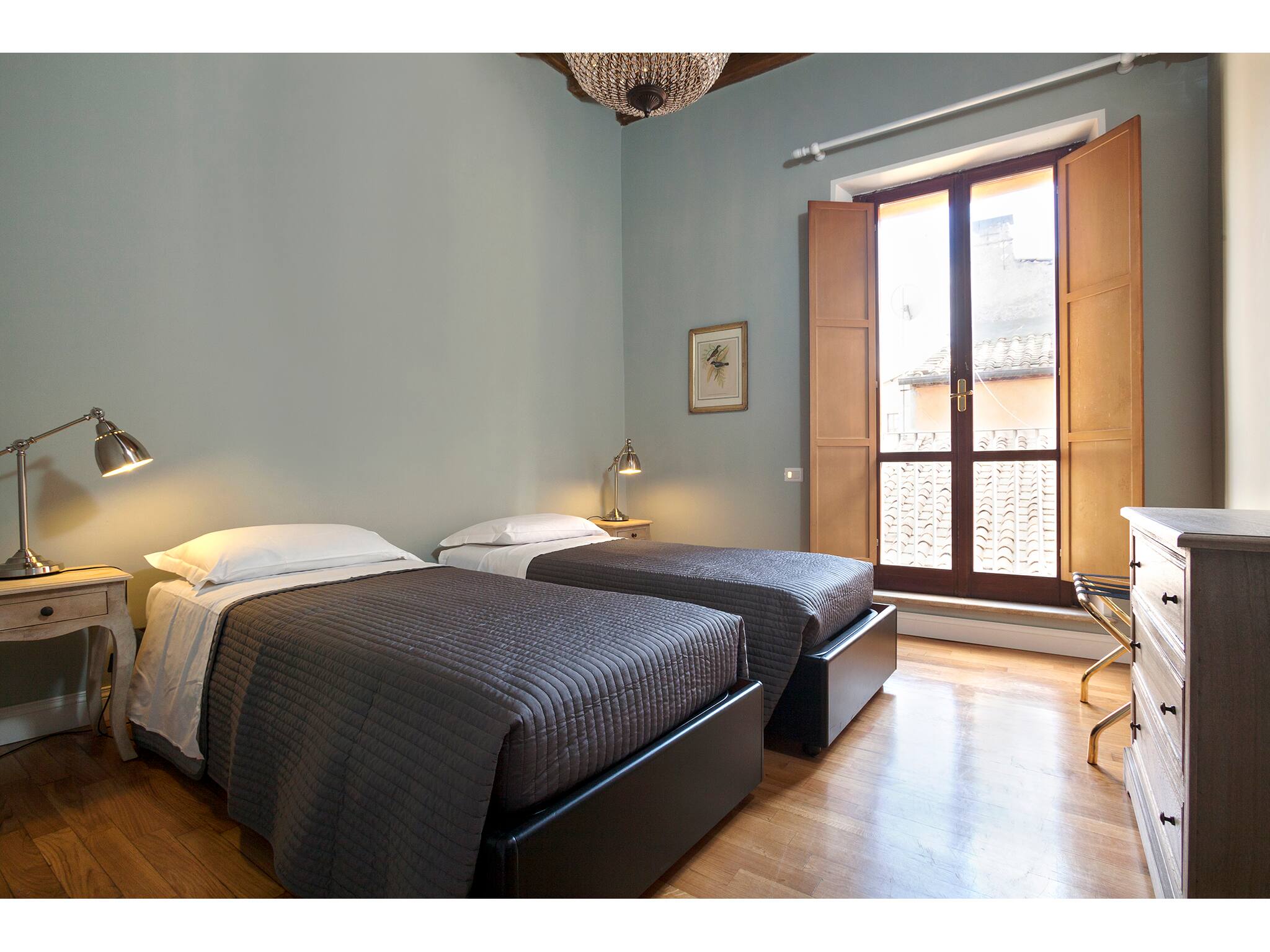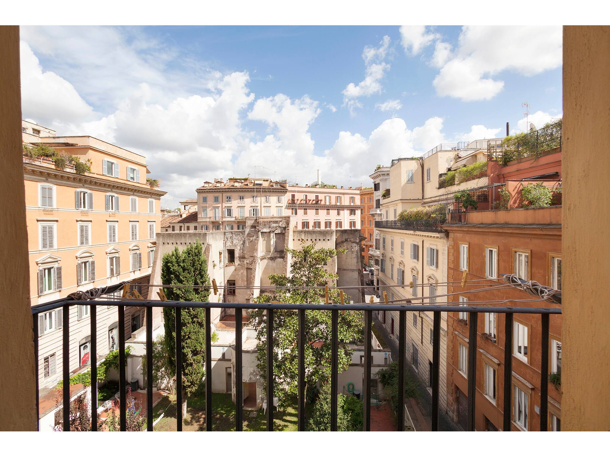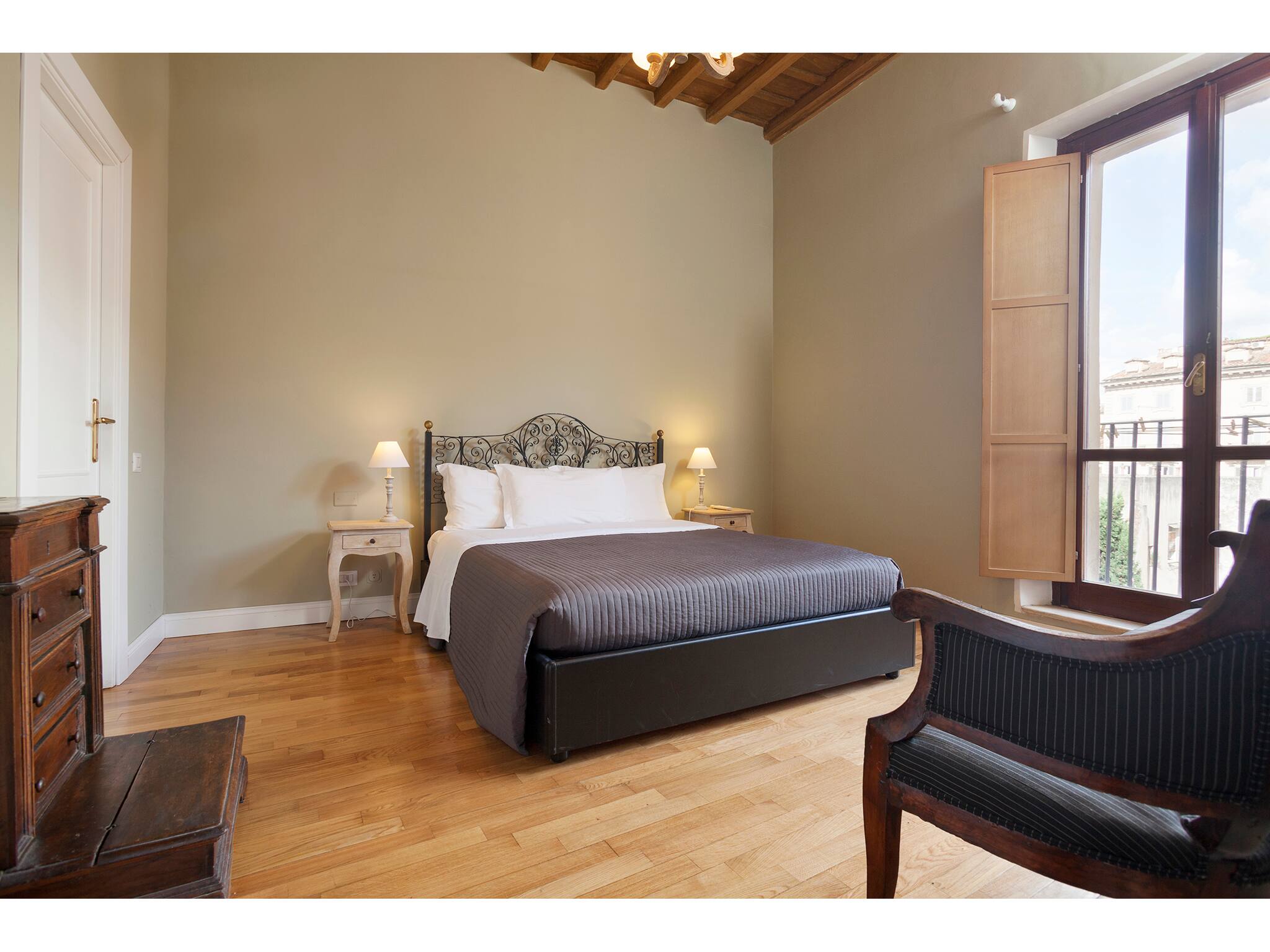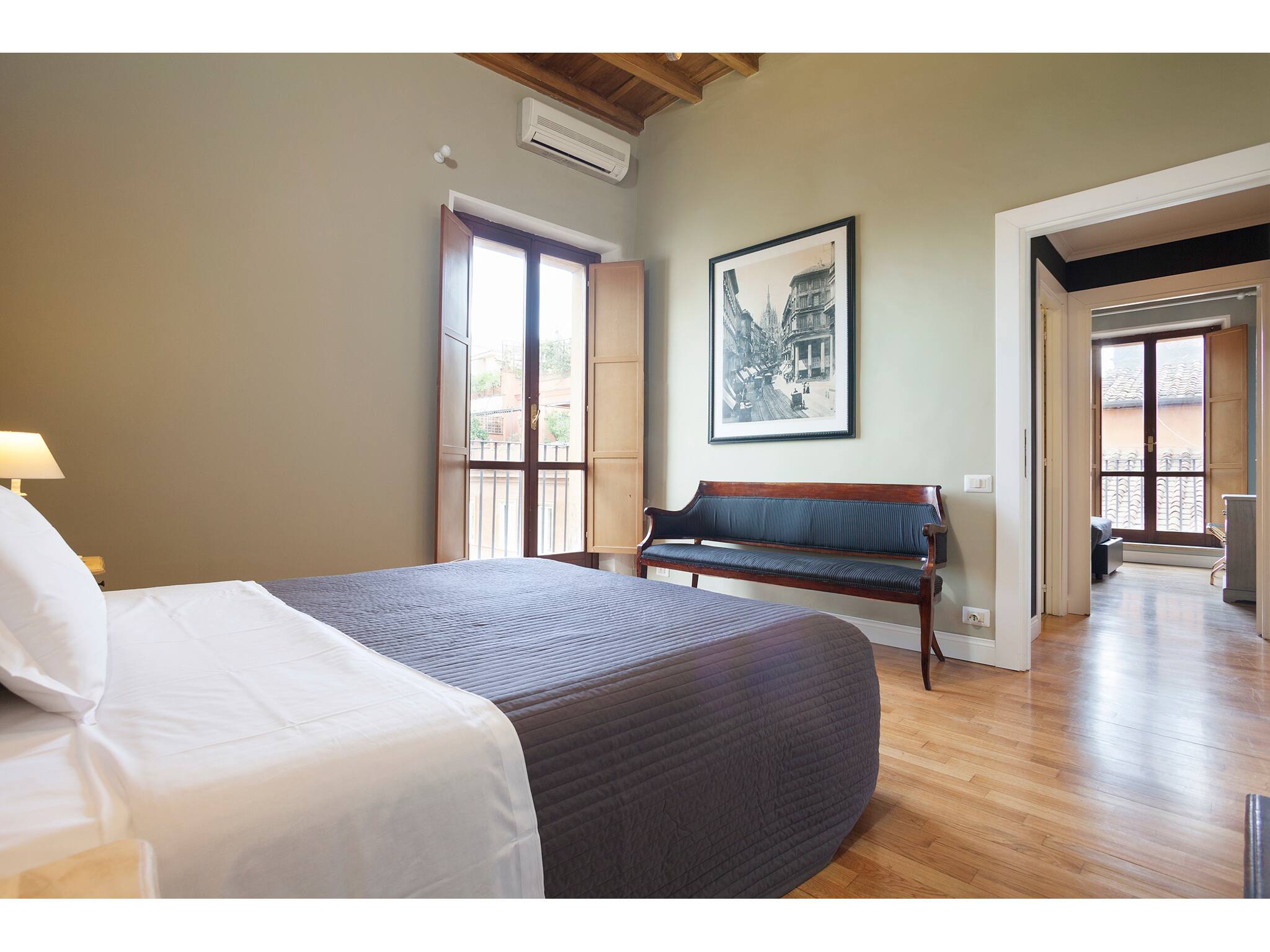 One of the apartment’s most charming features is the presence of small balconies overlooking Rome’s rooftops, offering unique and picturesque views that truly enhance the overall experience.